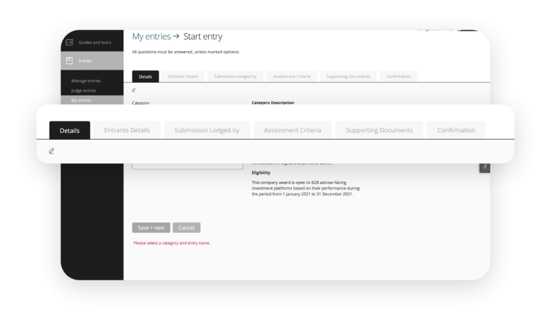 To submit an entry, fill all the fields across the different tabs and provide answers to the questions.