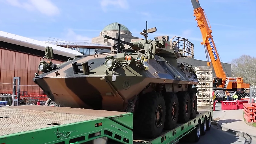 The Australian Light Armoured Vehicle, nicknamed “3:10 to Yuma” or “To Yuma”, was transferred by crane into the new Anzac Atrium of the Australian War Memorial earlier this month.
