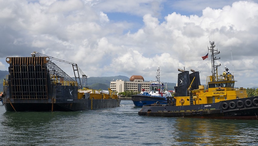 “After a brief visit to the Port of Apia to reconfigure the salvors’ barge, it’s back moored over Manawanui and they are making steady progress.